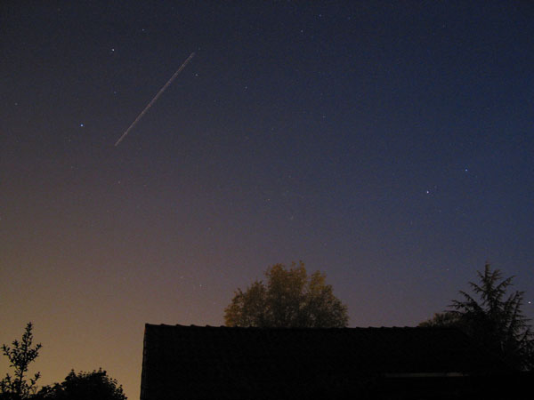 Das nachfolgende Foto zeigt zunächst einen Überblick über den Himmel. Auf der linken Seite erkannt man den "Kopf" des Sternbilds Löwe mit einer auffälligen Leuchtspur eines vorüberziehenden Flugzeugs. Auf der rechten Seite des Bildes sind Castor und Pollux vom Sternbild Zwillinge gut zu erkennen, unten am rechten Bildrand ist Saturn gerade noch sichtbar. Etwa in der Bildmitte, etwas über dem Baum hinter dem Nachbarhaus, befindet sich das Sternbild Krebs. Durch den doch etwas dunstigen Himmel und das Streulicht der Stadt aber nur zu erahnen.