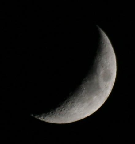 Zum Schluß noch ein auf die Helligkeit des Mondes abgestimmtes Bild, welches nur 1/320 Sekunde lang belichtet wurde, ansonsten aber identischen Daten (400ASA, Blende 7.1). Hier kann man deutlich die aus dem Feldstecheranblick vertrauten Mare und Krater des Mondes erkennen.