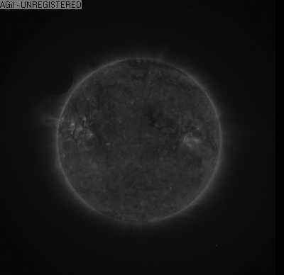 Oje! Dies Bilder wurden jedoch im ".fts" Format zur Verfügung gestellt. Für die allermeisten Bildbearbeitungsprogramme ist dieses Format überhaupt nicht lesbar. Auf meinem Computer verfüge ich jedoch über ein spezielles Programm zur Bildverarbeitung von astronomisch interessanten WebCam-Filmen mit dem Namen "giotto". Dieses Programm kann selbstverständlich auch Bilder in diesem Format einlesen, dann noch etwas bearbeiten (Kontrast, Helligkeit etc.), anschließend habe ich mir aus dem Internet noch schnell ein Programm zum erstellen von animierten gifs besorgt (deshalb die einzelnen Bilder auch als gif abgespeichert) und so entstand am gleichen Abend noch die nachfolgende Animation, welche einen ersten Eindruck über dieses himmlische Ereignis bietet: