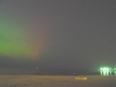 Am linken Bildrand erkant man die Ausläufer der großen grünlichen Himmelsaufhellung. Zwischen Castor/Pollux und Saturn ist ein rötlicher Strahl zu erkennen. Die Wirkung wurde gegenüber dem Originalfoto durch Anheben von Kontrast und Helligkeit etwas verstärkt. Mit bloßem Auge erschien dieser Strahl eher als eine "strichweise" weiße Aufhellung. Einzelne Strahlen dieser Art waren am Rande des grünlichen Bereichs immer mal wieder zu erkennen. Sie waren meist jedoch nur wenige Sekunden auszumachen und sind daher auch nur auf wenigen Fotos des Abends zu erkennen. Im Vordergrund des Fotos sieht man den Strand von Bansin, die starken Lampen rechts im Bild sind die Laternen der Seebrücke. Draußenn auf dem Meer sind auch noch die Lichter eines Ausflugsdampfers (?) zu erkennen.