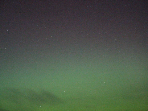 Wie die meiste der in dieser Nacht entstehenden Bilder wurde es mit den Einstellungen 400ASA, Blende 2.2, Belichtungszeit 15 Sekunden und Brennweite 7mm Weitwinkel fotografiert. Deutlich ist das grüne Polarlicht zu erkennen. Von der großen Bärin sind die meisten Hauptsterne zu sehen, einige dunkle Wolken fallen sofort ins Auge. Das Grün war mit bloßem Auge natürlich nicht so kräftig zu erkennen wie auf dem Foto, hier ist die Kamera mit ihrer längeren Belichtungsdauer doch eindeutig im Vorteil.