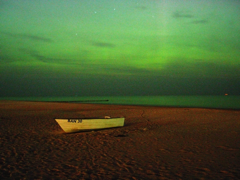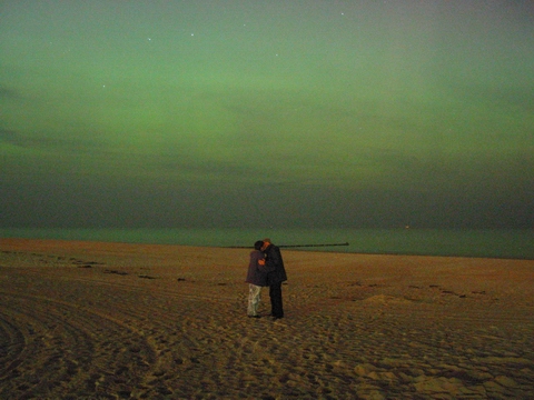 Ob mich wohl einer blöd anmacht, wenn er mich so abends im Dunkeln mit Stativ und Kamera über die Strandpromenade gehen sieht? Doch diese Ängste waren vollkommen unbegründet, keine Menschenseele zu sehen. Stattdessen - nein, das konnte es doch nicht sein, der Himmel Richtung Norden war ja total aufgehellt. Der große Wagen war auf Anhieb gar nicht zu erkennen, so hell war es dort. Scheinwerferlicht, was sich am Dunst bricht? Nein, mein Gott - so etwas hast Du noch nie gesehen, ging es mir durch den Kopf. Das konnte, das mußte das Polarlicht sein. War das diese kleine, leicht grünlich schimmernde Aufhellung, die man so manchmal am Nordhimmel nur wenige Grad über dem Horizont sieht? Wo wirklich nur eingeweihte wissen können, dass dies nichts mit Dämmerung zu tun hat, sondern doch nur Nordlicht sein kan? Das Aufhellungsgebiet war jetzt ja riesig! Es erhob sich im Westen unterhalb der Sternbilder Schwan und Leier, ging hoch hinauf bis zum kleinen Wagen und senkte sich dann im Osten wieder hinab, kurz vor dem Sternbild Zwillinge, das zusammen mit Saturn bereits aufgegangen war. Das waren doch glatte 90 Grad Horizontbreite und rund 50 Grad Höhe. Wie sollte ich das jemals mit meiner Kamera einfangen können?