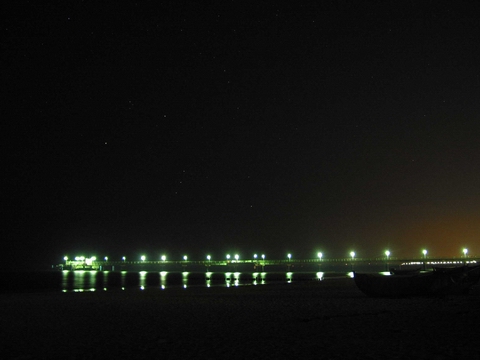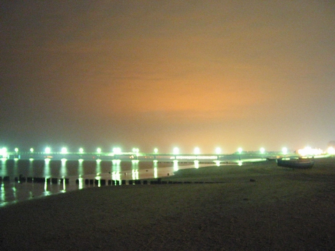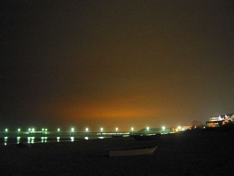 Richtung Süden, ziemlich genau über der Seebrücke war es - inzwischen auch mit dem bloßen Auge erkennbar - feuerrot geworden (15 sec., Bl. 2.0, 7mm, 400 ASA, 22:55 Uhr). Ich war hin und weg. Wo kam jetzt plötzlich dieses Rot her? Streulicht von irgendwelchen Hotels konnte das bestimmt nicht sein. Waldbrand hinter der Grenze nach Polen? Genauso unwahrscheinlich. Das mußte doch auch Polarlicht sein. Aber so weit im Süden, so nahe am Horizont?