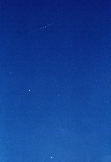 Am 8. Mai 2002 gelang mir diese Aufnahme eines Iridium-Flares. Es handelt sich dabei um Iridium 64, der laut heavens-above mit einer Helligkeit vom -1 mag an meinem Standort (51.783°N, 8.817°E) aufleuchtete. Dieser Standort war vom Flarezentrum gut 31 km in östlicher Richtung entfernt. Auf dem Bild erkennt man am unteren Rand die Wega und darüber Sterne des Sternbilds "Drache". Der Flare tauchte in einer Höhe von 50° in nordöstlicher Richtung auf. Die genaue Uhrzeit war 22:09 Sommerzeit, also 20:09 UT. Zu dieser Abendzeit war es noch nicht richtig dunkel. Fotografiert mit einem 20mm Weitwinkel-Objektiv uf Kodak Farbwelt 400 ASA. Belichtet ca. 2 Minuten Zurück zur Einstiegsseite |
