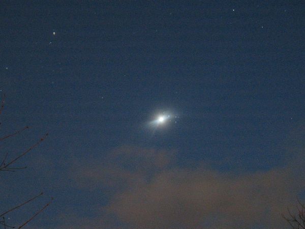 Am 3. April hatte ich zwischen Wolkenlücken wieder klaren Himmel. Heute steht die Venus "neben" den Plejaden, überstrahlt diese jedoch deutlich.